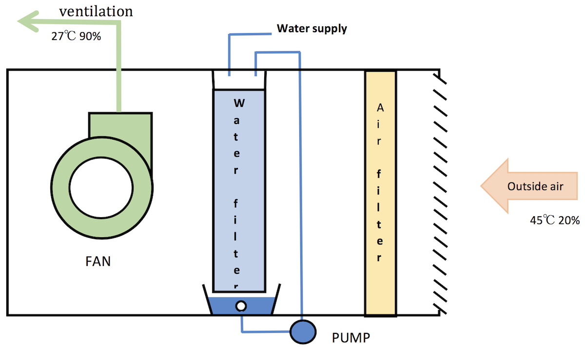 An air washer is a machine that uses the latent heat of water evaporation to lower the air temperature without using a refrigerator or chiller, and uses that air to perform air conditioning.